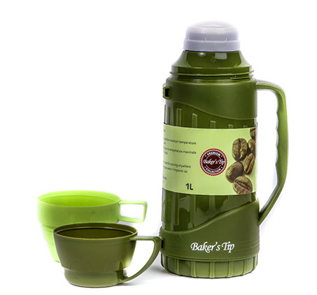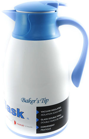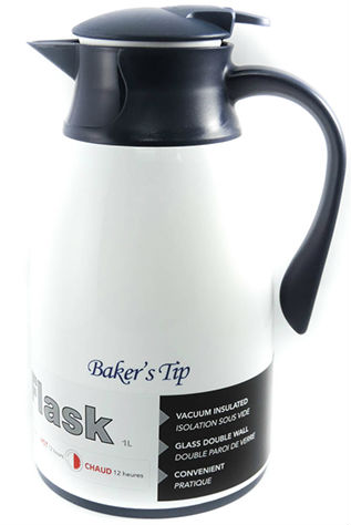 Baker’s Tip Coffee Pots are glass vacuum insulated for maximum temperature retention, hot or cold. This durable flask is portable and lightweight; it includes two built-in drinking cups for serving anywhere.