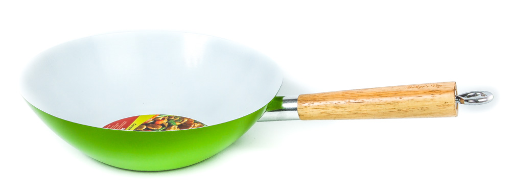 Add color and style to your kitchen with Baker’s Tip Ceramic Non-Stick Woks. Baker’s Tip Woks make cooking easier and adds style with its bold and vibrant colors. Its durable surface requires less oil and makes it a quick and easy cleanup. This stylish and functional wok comes in four vibrant colors and has a wooden handle.